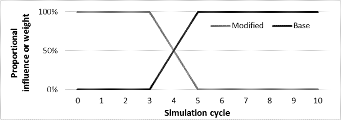 For the example above, the calibration will be activated immediately (cycle 0) and persist until cycle 3 (15 years). For cycles 3, 4, and 5, predictions from the calibrated model will be linearly diluted with base predictions starting at 100% calibrated predictions in cycle 3 down to 0% by cycle 5, respectively. From cycle 5 on, only base predictions will be used.