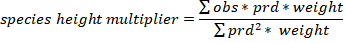 If number of height samples within a plot is ≥ 5 for an individual species, then species observed heights (obs) are compared against predicted heights (prd) from step 2 using basal area weighted least-squares to determine a basal area weighted bias correction factor to be applied to trees with missing heights of the same species.